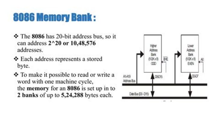 8086 Memory Bank : The 8086 has 20-bit address bus, so it can address 2^20 or 10,48,576 addresses. Each address represents a stored byte. To make it possible to read or write a word with one machine cycle, the memory for an 8086 is set up in to 2 banks of up to 5,24,288 bytes each.