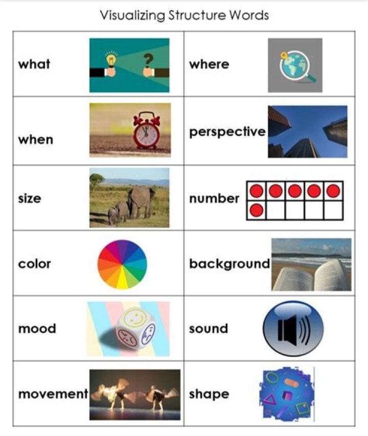 What are the Structure Words for Visualizing and Verbalizing? These structure words are “a list of descriptive words which provide a structure…from which to visualize, verbalize, and write.” (Visualizing and Verbalizing for Language Comprehension and Thinking Teacher’s Manual by Nanci Bell, p. 66).