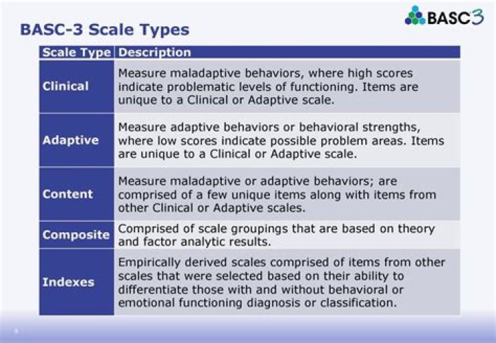 5 composite scores: Adaptive skills, Behavioral symptoms index, Externalizing problems, Internalizing problems, School problems (Measure Profile, 2012) “The BASC-2 consists of 16 primary scales and 7 optional scales, along with 5 composite scales.