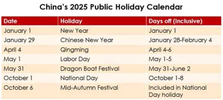 There are currently seven official public holidays in mainland China. Each year’s holidays are announced about three weeks before the start of the year by the General Office of the State Council.
