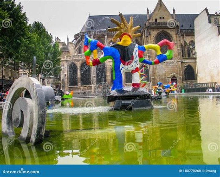 Within the basin are sixteen works of sculpture inspired by the compositions of Igor Stravinsky. The black mechanical pieces of sculpture are by Jean Tinguely; the brightly colored works are by Niki de Saint Phalle. The sculptures in the fountain represent: