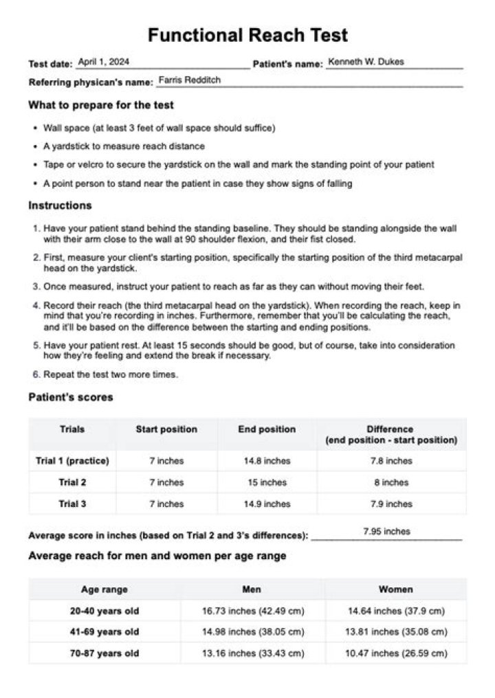 It measures the distance (using a yardstick at the level of the acromion) that an individual is able to reach forward from a starting standing position with a fixed base of support without loss of balance.